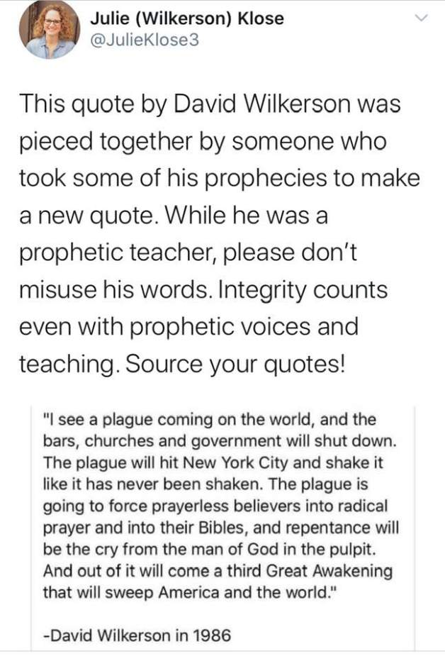 ¡Al menos, hasta que la sobrina de David Wilkerson la declaro como un engaño! Julie (Wilkerson) Klose, la sobrina de Wilkerson, se ha hecho pública diciendo que esta predicción es inexacta. Alguien la creó, con un pastiche de frases de Wilkerson, pero él nunca dijo esto como tal, no es que nadie tenga pruebas de ello.