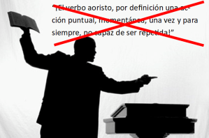Por dicha, últimamente han escudriñado bien el sistema del verbo griego, y tenemos una idea más clara de cómo los escritores antiguos querrían ser entendidos. Las malas noticias son que el sentido exegético de los tiempos todavía se ahoga con ideas erróneas, mucho del desperdicio del siglo XIX. Tome como ejemplo los mitos viejos sobre el aoristo: que es una acción puntual, o que es completa, o que no puede repetirse. Estas nociones populares no se manifiestan solo en los púlpitos o en los blogs; también, campean en comentarios estimables y en gramáticas estándares. Alguien podría edificar – de hecho, ¡sí han edificado! – sistemas enteros de doctrina sobre un solo “aoristo puntual.”