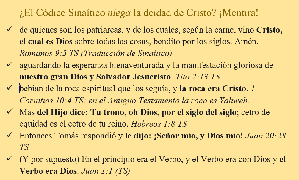 A propósito – los gnósticos nunca negaban la deidad de Cristo; negaban su humanidad. ¡Si Sinaítico fuera un complot gnósticos, no contendrían textos como «Y aquel Verbo fue hecho carne» (Juan 1:14 TS) ni «y todo espíritu que no confiesa que el Señor Jesús ha venido en carne, no es de Dios» (1 Juan 4:3a, nuestra traducción de Sinaítico, que es un poco diferente que Reina Valera 60)! Los gnósticos también botaron los doctrinas de la creación del universo por el Padre, negaron que Dios es uno, botaron la muerte de Cristo, la expiación por pecado, su resurrección, su segunda venida, la resurrección final y el juicio final, el evangelio de salvación de pecados, la trinidad, el Antiguo Testamento, que el mensaje divino es para cada ser human, etc., etc. ¡Doctrinas que Sinaítico afirman por todo lado! Si es un documento gnóstico, ni siquiera un gnóstico reconocería. Y nadie hoy en día quien ha estudiado el gnósticismo, sus doctrinas y sus escritos, podría etiquetarlo como gnóstico.