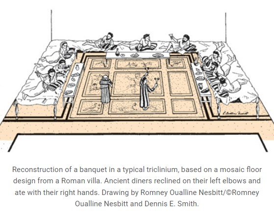 En un comedor (en latín, triclinium) de una casa adinerada en Corinto se habrían sentado hasta nueve personas.