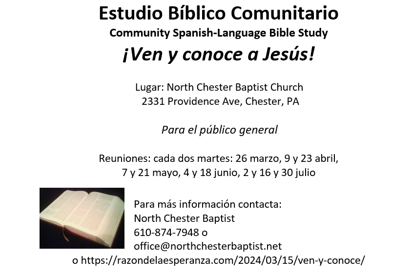 Para usted o sus amigos de habla hispana en el área de Chester, Pennsylvania, tenemos un estudio bíblico evangelístico/discipulado cada dos martes por la noche a las 6pm, en North Chester Baptist. Nos dicen que solo en Chester hay mas de 9 mil residentes hispanos. También hay gente que viene de otras áreas, incluyendo Delaware. Además de esto, de 5pm-6pm en el sótano de la iglesia hay una bodega de alimentos gratis, que da todo tipo de productos enlatados libres, productos secos, frutas, verduras, carnes. En estos meses estudiamos el Evangelio de Marcos, versión DHH.