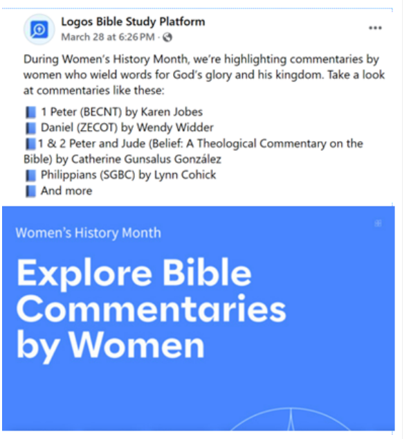 En marzo, Logos publicó un lindo anuncio en su página de Facebook, presentando comentarios bíblicos escritos por “mujeres que manejan las palabras para la gloria de Dios”. De los que destacaban, yo acababa de utilizar el comentario de Karen Jobes para ayudarme a traducir un pasaje de 1 Pedro, con gran provecho; por no hablar de la ayuda que me ha prestado su material de clase mundial sobre la Septuaginta.