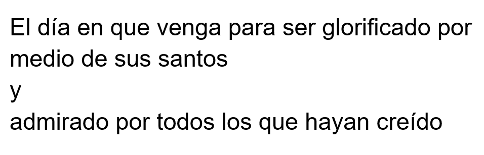 La Nueva Traducción Viviente trata 1 Tesalonicenses 3:13 como “cuando nuestro Señor Jesús regrese con todo su pueblo santo”. De hecho, la NTV concuerda con la mayoría de las versiones en inglés: “todos sus santos” (RV 60; BJL, LBLA, NBLA, NVI; DHH, NLT – “el pueblo santo de Dios”; TLA – “pueblo elegido”). Esto introduce en el texto una característica que no es explícita: que Pablo está hablando del pueblo santo. (Yo también parafrasearé el texto, como se ve a continuación; mi objeción a la RV 60 etc. es que creo que el referente es incorrecto).