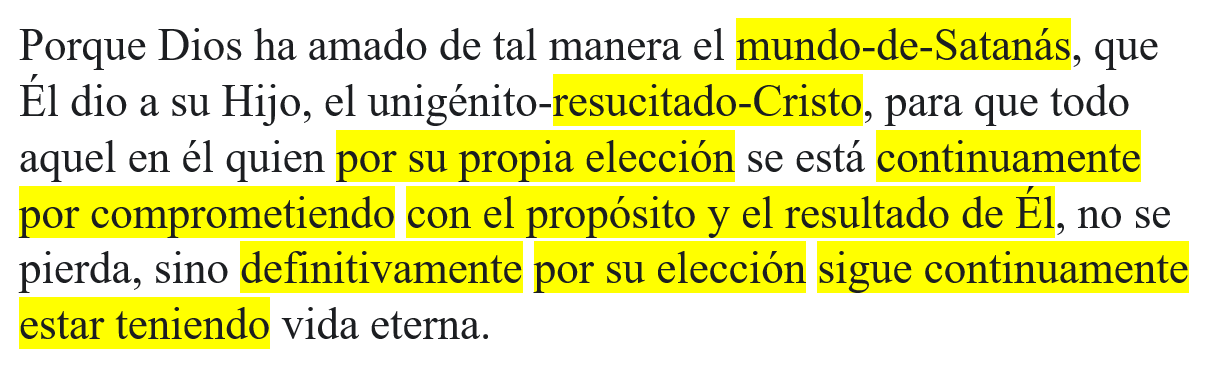 Porque Dios ha amado de tal manera el mundo-de-Satanás, que Él dio a su Hijo, el unigénito-resucitado-Cristo, para que todo aquel en él quien por su propia elección se está continuamente por comprometiendo con el propósito y el resultado de Él, no se pierda, sino definitivamente por su elección sigue continuamente estar teniendo vida eterna.