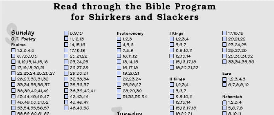 Leer toda la Biblia en un año es un objetivo estupendo para cualquier año. Y mi plan de lectura favorito es el extravagantemente llamado «Plan Bíblico para los Vagabundos y Poco Autodisciplinados». ¿Por qué este nombre? Porque la mayoría de los planes de lectura se arruinan si te pierdes un par de días, te sientes culpable o fracasado y abandonas. Este tiene una característica especial: puedes faltar un día o incluso días, ¡y aun así no saltas las vías del plan! Sólo tienes que retomarlo donde lo dejaste. (Nota: está en inglés. No obstante, el hispanohablante puede seguirlo fácilmente.)