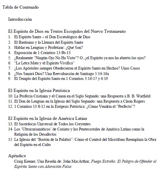 Es una colección de 15 de mis ensayos, escritos a lo largo de muchos años. El eje principal es el Nuevo Pacto como elcump,imiento de la promesa del Espíritu. Además de la reseña de Craig Keener sobre Fuego Extraño, de John MacArthur.
